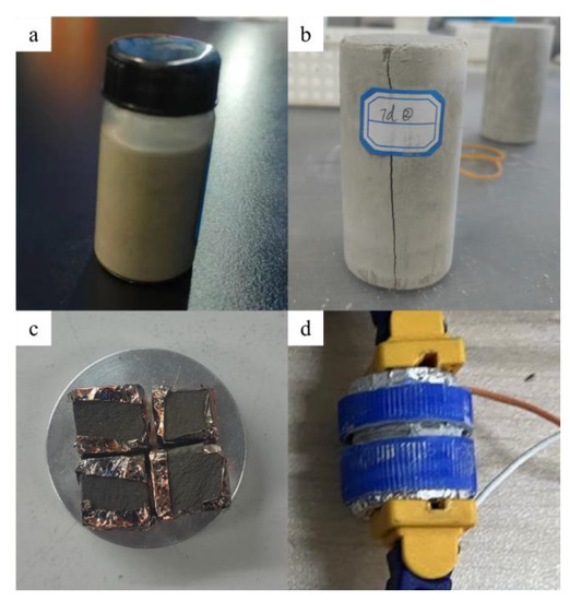 Schematic diagram of experimental materials: (a) CFTFS by NMR analysis; (b) CFTCB by UCS; (c) CFTCB by SEM; (d) CFTFS by volume resistivity experiment.