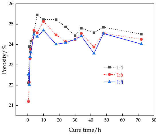 The variation in porosity in the hydration process of the CFTFS with different CTRs is shown in Figure 6. With the increase in the curing time, the porosity of the CFTFS shows a rapidly increasing trend at first, followed by a slight decrease, and finally stabilizes at approximately 24%. The decrease in the porosity directly shows the process of backfilling the sample from loosely to densely and reflects the generation of hydration products and the nucleation crystallization mode. The porosity of the CFTFS increases with the CTR.