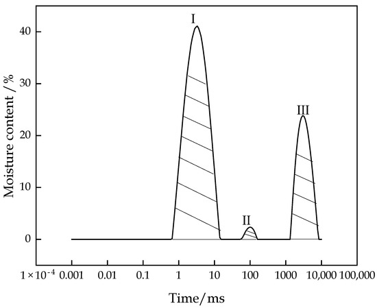 The variation trend of the T2 spectrum distribution of the CFTFS with a CTR of 1:6 within 0–10,000 ms is shown in Figure 7. The figure shows that the T2 spectrum includes three relaxation peaks, which are denoted as peaks I, II, and III from left to right. The distribution of each peak is as follows: Peak I ranges from 0.65 ms to 14.15 ms, Peak II ranges from 51.71 ms to 148.20 ms, and Peak III ranges from 1431.46 ms to 7842.82 ms. Each relaxation signal corresponds to a kind of water, so this experiment detected the existence of three different bound states of water in the CFTFS. The CFTFS has adsorbed water, chemically bound water, free water, and pore water. The results of previous research [24] show that the T2 value of chemically bound water is very transient, so the relaxation signal of the chemically bound water cannot be obtained by the NMR experiment. Therefore, the three relaxation peaks of the T2 spectral inversion curve correspond to the NMR signals of the hydrogen nuclei in the adsorbed water, the free water, and the pore water. Studies have shown that [25] the fluidity of water is positively correlated with the T2 value. Accordingly, peak I corresponds to the relaxation signal represented by the adsorbed water. Peak II corresponds to the relaxation signal represented by the pore water, and peak III corresponds to the relaxation signal represented by the free water. Figure 7 shows that peak–peak area I occupies the largest proportion. Adsorbed water is the main form of water in the CFTFS, with the adsorbed water content accounting for approximately 40%, followed by the free water and pore water contents.