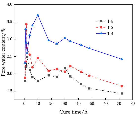Figure 8 shows that the change in the pore water content of the CFTFS presents a trend of sharp fluctuation–rapid increase–slow decrease due to the settlement process of the CFTFS particles in the early stage, resulting in constant changes in particles and pores. The instrument test is only an instantaneous value, so it presents dramatic fluctuations in the early stage. Then, the intermolecular movement accelerates, the pore size enlarges, and the pore water content increases with the progress of the hydration reaction. When the hydration reaction reaches a certain degree, the hydration reaction rate and pore water content decrease.