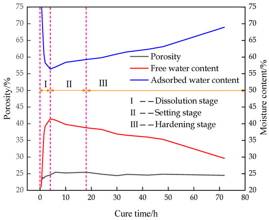 To obtain the hydration characteristics of the CFTFS, the porosity of the CFTFS (CTR of 1:6) was combined with the variation curves of free water and adsorbed water, as shown in Figure 9. The figure shows a good correlation in different periods, which reflects the hydration characteristics. The hydration process can be divided into dissolution stage I, setting stage II, and hardening stage III. In the dissolution stage of the hydration process, the intermolecular movement is accelerated, the pores are enlarged, and the pore water content is increased with the drastic changes in the hydration reaction. Moreover, a part of the adsorbed water is separated from the tailings particles and gathered in the upper part of the sample bottle as free water due to the settlement of tailings particles, rapidly decreasing the adsorbed water content and rapidly increasing the free water content. During the setting and hardening stages of the hydration reaction, the free water separated from the upper part of the sample bottle reacts with the filling material again, resulting in a slow increase in adsorbed water and a decrease in free water. The specific analysis is as follows: