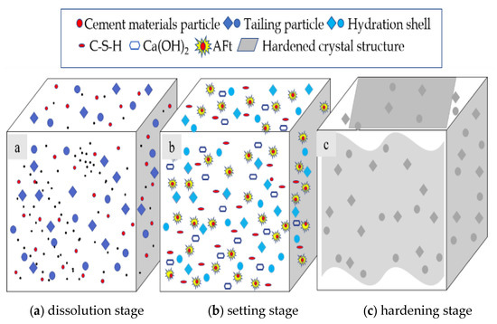 With the continuous dissolution of each component in the filling C material and the active component in the classified fine tailings, at this time, the slag glass body disintegrates, and Ca(OH)2 reacts with Al2O3 and SiO2 to form C-S-H gel. This stage is mainly a hydration reaction process of the filling C material. The effect of the hydration of the filling C material on the classified fine tailings is generally regarded as the passing of hydration product C-H through the phase interface to form a hydration film on the surface of the tailing particles, as shown in Figure 10b.