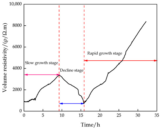 The change characteristics of the volume resistivity of the CFTFS with a CTR of 1:6 were divided into three stages, namely, slow growth stage I, decline stage II, and rapid growth stage III, as shown in Figure 11. The volume resistivity of the sample increases slowly first, decreases, and then increases rapidly over time. This trend can be explained by the increase in the CFTFS’s internal temperature after stirring the filling c material with water. When the temperature of the semiconductor material increases, such as the filling c material, the internal electron movement intensifies, and the resistance of the carrying current decreases, thus reducing the resistance of the material. In addition, after adding water to the filling c material, the soluble components in the filling c material dissolve, and mineral hydrolysis occurs, resulting in the increase in the ion concentration in the filling slurry and the enhancement of the electrical conductivity. In the first stage, the cementation process of the hydration reaction of the sample is dominant, and the generated hydration products cause the volume resistivity of the sample to increase slowly. In the second stage, the resistance and the volume resistivity decrease due to the increase in the ion concentration. In the third stage, the sample slurry gradually condenses with the progress of the hydration reaction, leading to the gradual increase in the internal resistance of the material, indicating that the resistivity increases with time. The hydration reaction stage is in the dissolution stage within 0–4 h, the setting stage within 4–18 h, and the hardening stage after 18 h. The volume resistivity increases slowly during the dissolution stage of the hydration reaction. During the hardening period, the volume resistivity increases rapidly. In particular, the volume resistivity in the setting phase of the hydration reaction shows three trends with the increase in time, depending on the degree of hydration reaction.