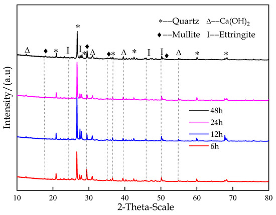 Figure 12 shows the XRD patterns of the classified fine tailings filling materials with a CTR of 1:6 at different curing times. According to the phase retrieval results, hydrated products, such as Ca(OH)2 and Aft, formed after the condensation of the classified fine tailings filling material. After curing for 6 h, Aft and Ca(OH)2 formed in small amounts. After 12 h, the relative contents of Aft and Ca(OH)2 increased, indicating that more hydration products were generated with the progress of the reaction. Ca(OH)2, which belongs to the tripartite crystal system, is the product of the hydration reaction, and the crystals mostly exhibit a flake-like structure. Aft is the product formed by the reaction of C3A in the silicate filling c material and the gypsum. It is worth noting that after the hydration reaction, mullite was detected by XRD. Mullite may come from tailings or filling C material, and it is not a hydration product. As the C-S-H gel is an amorphous phase, it cannot be detected by XRD, so SEM can be used for observation.