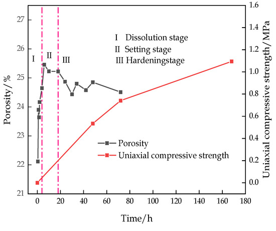 Figure 15 shows the variation curve of the porosity and the UCS over time. The figure indicates that the porosity of the sample decreased when the dissolution stage ended, but the backfill had a denser structure, and the strength of the backfill continuously increased with the progress of the hydration reaction.
