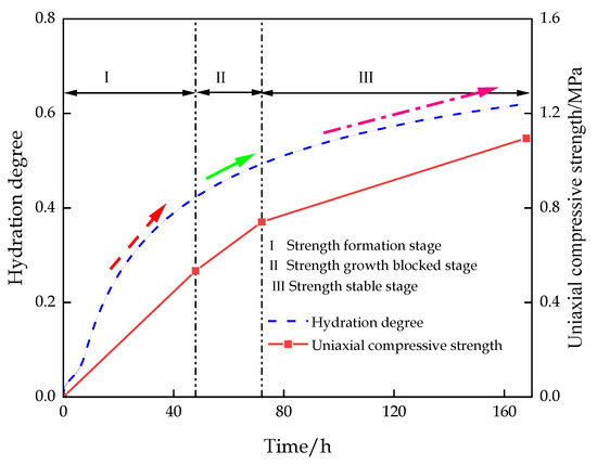 The CEMHYD 3D hydration model was used to numerically simulate the microstructure evolution in the hydration process. The changes in hydration degree, hydration products, and porosity with hydration time were obtained. The calculated results of the analyzed hydration model were basically consistent with the experimental data. As shown in Figure 16, according to the degree of hydration reaction, the variation in backfill strength can be divided into three stages: strength formation stage I, strength growth blocked stage II, and strength stable stage III. The analysis combined with the stage characteristics of the hydration reaction and the hydration product as follows: