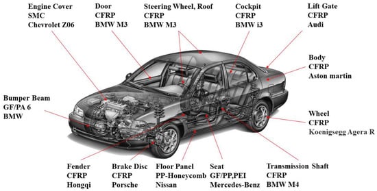 A composite material is a multiphase solid material composed of two or more substances with different physical or chemical properties. Commodities made from it have the advantages of high quality, high specific strength, high specific rigidity, and high corrosion resistance. However, the composite material also has some limitations and disadvantages, such as environmental sensitivity, a relatively low damage tolerance, a time-consuming manufacturing process, an expensive cost, and limited strength in the direction perpendicular to the fiber orientation. Despite the challenges, composite materials continue to be widely used in the lightweight field of automobiles, as shown in Figure 3.