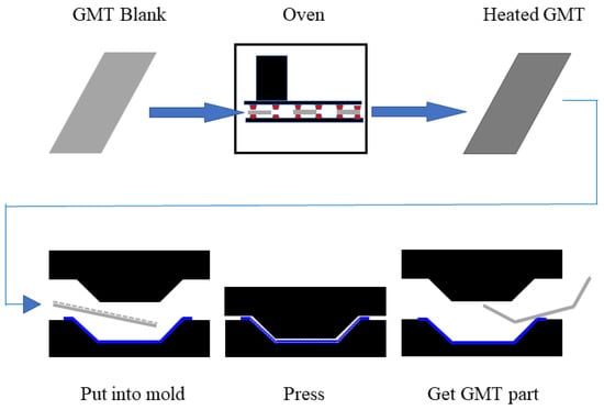 Fabrication and product performance are intently allied. For example, composite materials and processes demand they be in accordance and support each other. The fully developed fabrication method guards the excellent performance of composites. In the 1960s, the United States began developing glass-mat-reinforced thermoplastics (GMT), and it was employed in mass production in the 1990s [27]. The GMT molding process is shown in Figure 7. GMT is used in the fabrication of automobile rear bumper beams in vehicle parts production. The molding cycle of GMT is 30–40 s. GMT bumpers have been in continuous service in various passenger cars for more than three decades due to the utilization of regenerated, short molding cycles and high production efficiency. The front bumper of the 1984 Chevrolet Corvette was the first to use GMT composites. After the Corvette bumper, the GMT design launched on Cadillac DeVille, Brougham sedans, etc. The GMT was used for the first time on the rear bumper of the Ford Continental DN9 sedan. Over 16% of passenger cars were equipped with GMT bumper beams globally in the 1990s. The service of GMT presents opportunities for a light weight and cost reduction.