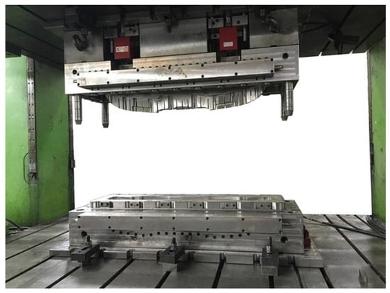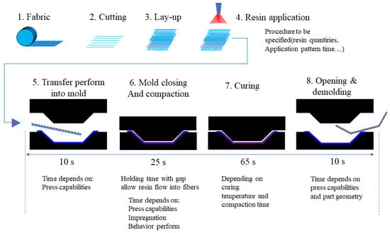 Wet compression molding (WCM, wet pressing, liquid compression molding) is a novel measure of composites that produce molding, and its molding cycle is around 110 s. KraussMaffei was the first to implement it, then the Cannon from Italy and Dieffenbacher from Germany carried out the development of wet molding, respectively. The process of wet molding is shown in Figure 8 [27]. It is characterized by employing dry fibers and liquid resins as raw materials instead of fiber-reinforced resin prepreg. The primary steps of wet compression molding to manufacture the bumper beam is first to design the carbon fiber cloth in the light of the figure, then infiltrate the fiber cloth into the abrasives, and clamp, solidify, and apply pressure to it, thus gaining a semifinished product. After opening the pore and edge trim, we obtained the bumper. The WCM fabrication has advantages that produce swiftness, efficiency, and automation. It was employed in parts of BMW and Audi vehicles widely for a series.