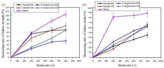 Experimental results for strain rate-dependent mechanical properties of GFPP, including the fiber direction, transverse direction, and shear: (a) increasing ratio of ultimate failure strength; (b) decreasing ratio of failure strain [36].