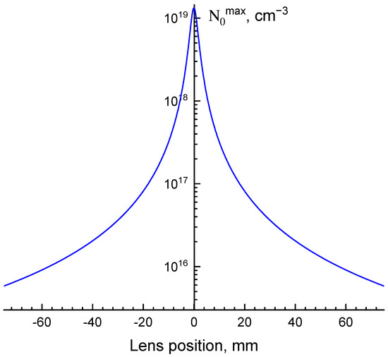 Considering all of the parameters, the variation in the density of excitations was determined using (1) as from ~1015 to ~1019 cm−3. The dependence of excitation density on the position of focusing lens is presented in Figure 1.
