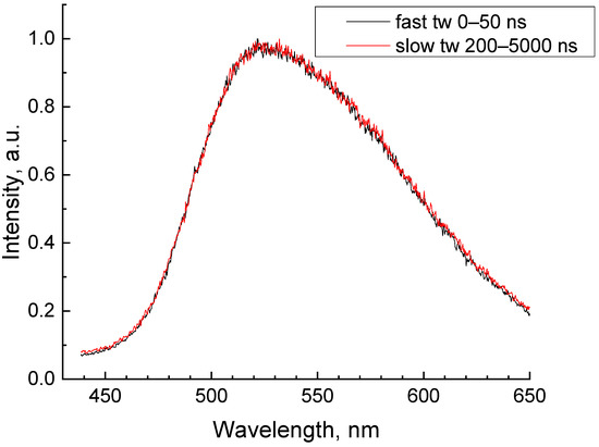 A broad non-elementary band peaking at 525 nm was observed in the luminescence spectra of GAGG:Ce (Figure 3). The band arose due to 5d(1)–4f transitions within Ce3+ ions. The band profile does not depend on the excitation density as well as on the time windows used for the experiment.