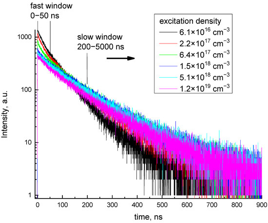 In contrast to Y3Al5O12:Ce and alkali halides, the presence of a gadolinium sublattice in gadolinium-containing crystals allows for the formation of additional pass-ways of energy transfer from the host to the emission centers. This will result in the appearance of delayed components in the emission decay, as was shown for cerium-doped gadolinium orthosilicates in [5]. One can expect redistributions between different pass-ways of energy transfer with the excitation density under interband excitation. Previously, the decay kinetics of GAGG:Ce were widely studied using high-energy sources such as X-ray, gamma, and electron beams and usually several decay components (corresponding to intracenter 5d–4f Ce3+ transitions as well as delayed ones) were detected [4,17,18,19,20,21]. However, in case of high energy excitation, a variety of excitations are created, whose energy and spatial distribution changes throughout the track of the high-energy particle (or quanta) absorbed in the GAGG:Ce. As a result, the distribution between different pass-ways to Ce3+ emission centers is averaged and the manifestation of density effects in decay kinetics is smeared.