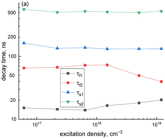 A set of decay curves obtained for the excitation densities from = 6.1 × 1016 cm−3 (lens out of focus) to = 1.2 × 1019 cm−3 (lens in focus) are presented in Figure 4. From the figure, the initial part of the decay curve is supressed while it increases for the τ > 200 ns with an increase in excitation density. The fit of the decay curves with the sum of four exponential components has been performed (Figure S3 of Supporting Information). The curves can be fitted by the same set of decay components, two fast (τf1, τf2) and two slow (τs1, τs2), regardless of the excitation density. The characteristic decay times were τf1 = 16.4 ± 2.4, τf2 = 61.1 ± 13.5, τs1 = 138 ± 12, and τs2 = 517 ± 22 ns, Figure 5a. The fastest component τf1 is artificial and arises due to the electronic distortion of the decay curve, namely pulse miscounts during the dead time after pulse registration. Another fast decay component τf2 ~ 60 ns corresponds to the characteristics of 5d–4f intracenter electronic transitions in Ce3+ ions. Two slower components (τs1, τs2) arise due to the delayed energy transfer from the host to Ce3+ ions. In contrast to the decay times, their amplitudes depend on the excitation density (Figure 5b). The amplitudes of two fast components decrease while those of slow ones increase with the increase in excitation density.