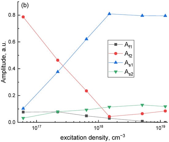 The dependence of the decay curves fitting parameters—decay times (a) and amplitudes (b) on the excitation density.