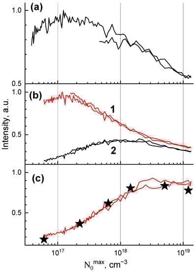 Time-resolved Z-scans measured in the fast (0–50 ns) and slow (200–5000 ns) time windows are presented in Figure 6b. For the fast time window, the curve is similar to that obtained for the whole temporal region (Figure 6a). In contrast, for the slow time window, an increase in intensity is observed for the densities up to ~1018 cm−3. The effect is saturated at ~ 2 × 1018 cm−3 which can be deduced from the constant in the ratio between fast and slow time windows (Figure 6c). The ratio between delayed and prompt decay components was also determined from the fit of decay components presented in Figure 5 as (τs1As1 + τs2As2)/(τf1Af1 + τf2Af2). The corresponding data are presented by asterisks in Figure 6c and they coincide with the curve obtained from the time-resolved Z-scan experiment.