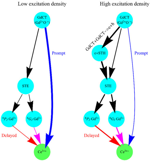 Scheme of the energy transfer pass-ways from the excitons to Ce3+ emission centers in GAGG:Ce in case of low (at left) and high (at right) excitation densities. GdCT—Gd charge transfer exciton; STE—self-trapped exciton; STH—self-trapped hole, Ce3+*-excited cerium ion.