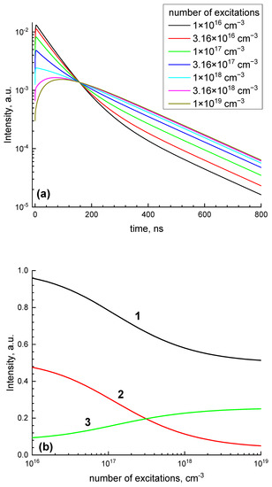 The dependence of the Ce3+ emission intensity measured in the whole temporal region (0–20,000 ns) on the density of excitations (Z-scan) is presented in Figure 6a. The luminescence intensity decreases with the excitation density increase that is related to exciton–exciton interaction. The threshold excitation density needed for the luminescence suppression is only =2 × 1017 cm−3. Such a value implies a relatively low concentration of excitations. The mean distance between the excitations for this excitation can be estimated as ~17 nm. The calculated value exceeds the typical values of dipole–dipole interaction distances (Rd-d < 5 nm) by several times [8,9,10,11]. Therefore, we suppose that the interaction occurs between mobile excitons in the case of GAGG:Ce.