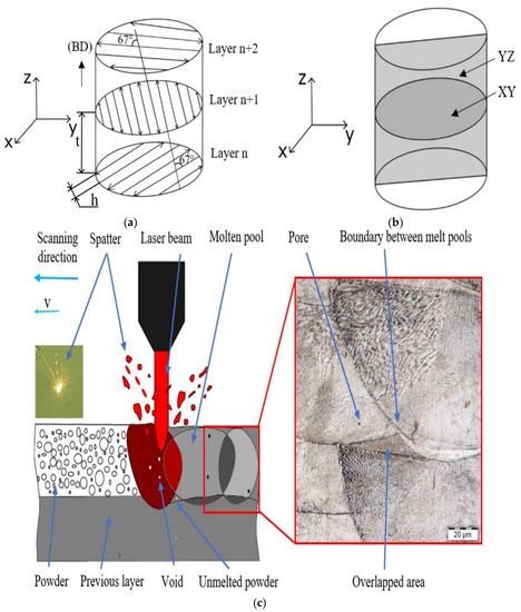 The process of heat treatment of the individual samples consisted of solution treatment (ST) at 840 °C/1h. ST was followed by aging treatment (AT) at temperatures of 420 °C/6 h to 520 °C/6 h. The heat treatment within this study was performed for 6 h, as it can be expected that with a reduced precipitation time (e.g., 3 h), there would be no significant changes in microhardness and compressive yield strength [42]. The samples were cooled in air to room temperature. After cooling, the microhardness of the individual samples was measured in the XY and YZ planes (see Figure 1b). These planes were chosen to describe the microhardness in the horizontal and vertical directions. Microhardness measurements were performed on a LECO 247 AT hardness tester for all the aging temperatures. The aim was to describe the dependence of microhardness on the aging temperature, because with appropriate heat treatment, production costs can be saved while the required mechanical properties can still be achieved. Figure 1c shows the mechanism of formation of the individual layers. The laser beam melts the powder locally and a molten pool is formed. The size of the melt pool depends on the energy density. The higher the energy density, the larger the melt bath and the better the melting of the metal powder [39]. Higher density can be achieved by increasing the laser power. However, higher laser power can cause more spatter, which can affect the surface layer [43]. The combination of individual process parameters affects the formation of the resulting structure and its porosity [36]. The resulting structure with less porosity will have higher resistance to wear and fatigue [59].