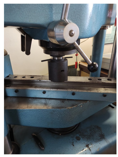The heat treatment process itself took place using the DIL 805A/D (Trencin, Slovakia) furnace. The printed sample had to be machined to the required dimensions. This was followed by mounting a G20P-A (Trencin, Slovakia) thermocouple to the surface of the sample, which scanned the temperature of the sample and controlled the heat-treatment process. The sample was then fixed between two spikes in the furnace space. After the heat treatment, the thermocouple was removed and the samples were placed in a special fixture (see Figure 2) in which the quasi-static test was performed. Compressive loading was carried out on a machine with an EDC 60 control unit (Brno, Czech Republic). The sample was pressed at a constant speed of 10 mm min−1. The TIRAtest v.2.1 program was used to obtain the data needed to determine the loading curves.