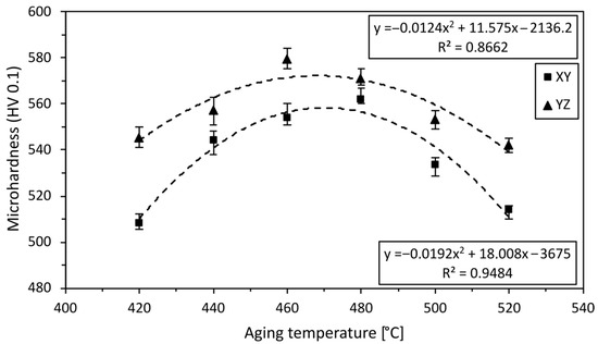Dependence of Vickers microhardness on aging temperature (the microhardness is depicted in the XY and YZ planes).