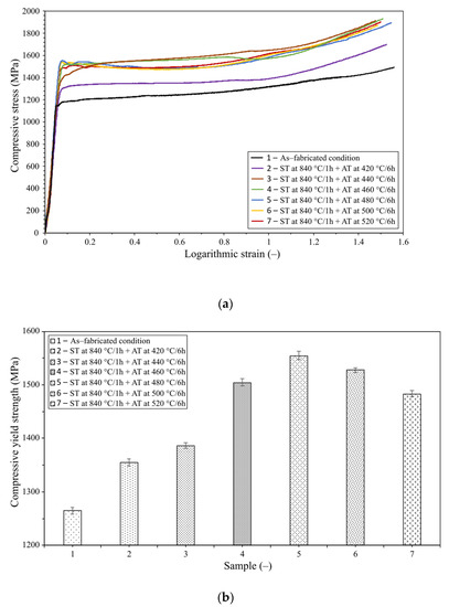 Figure 4a shows a graph depicting the dependence of compressive stress on logarithmic strain for all the examined samples (identical compression stroke was applied). The imposed strain was comparable for all the samples. The as-printed sample had the smallest compressive yield strength value of 1265 MPa. Conversely, the largest value of 1554 MPa was achieved for the sample that was aged at 480 °C/6 h (see Figure 4b depicting the values of compressive yield strengths for the individual samples). This means that the aging process resulted in a 22.8% increase in the compressive yield strength compared to the as-printed state. The results show that as the aging temperature increases, the hardness and compressive yield strength increase as well. This trend was observed up to a temperature of 480 °C, where the compressive yield stress decreases, most probably due to structural changes (see the following section). The higher the compressive yield strength, the higher the dynamical load that the components should be able to bear [43].
