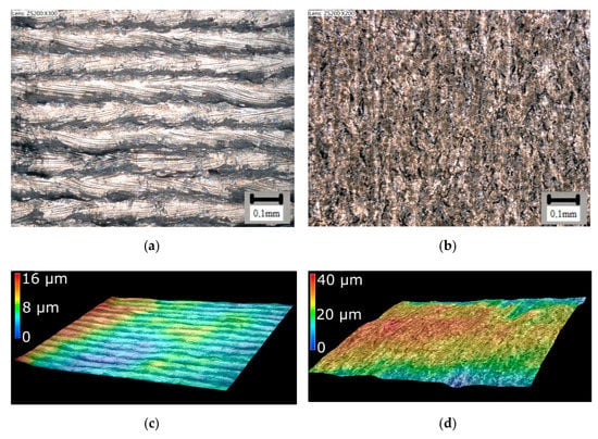 3D printing is based on the principle of placing individual layers on top of each other until the entire part is fabricated. Figure 5a shows a view of the front surface of the sample directly after printing. In this figure, individual tracks that correspond to the hatch distance can be seen. Figure 5b shows a view of the cylindrical surface of the sample, and Figure 5c,d then show sample surface images created using a KEYENCE digital microscope. Obviously, the surface structure does not have the quality required to be considered a functional surface (Ra 10.1 µm, Rz 23 µm), and, therefore, it is necessary to machine these surfaces [62,63].