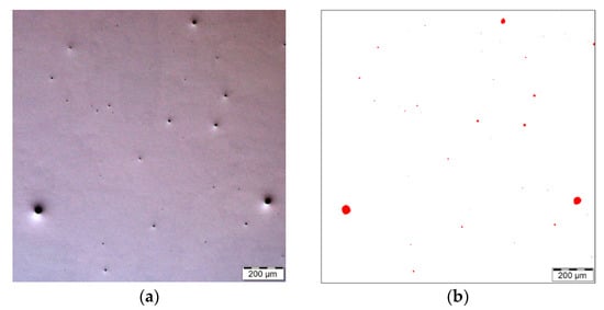 The process parameters of 3D printing, i.e., laser power 400 W, layer thickness 0.04 mm, hatch spacing 0.095 mm, and scanning speed 830 mm.s−1, resulted in the creation of a structure with a residual porosity of 0.220% in the XY plane and 0.274% in the YZ plane (see Figure 6). The average pore size was 83.6 µm in the XY plane and 66.3 µm in the YZ plane. The porosity was investigated on polished sample 1 (as-fabricated). The presence of pores is most probably due to the presence of gas that remained trapped in the material during sintering of the individual layers [64,65]. Similar results were achieved, e.g., by Casalino et al. [39]; decreasing the porosity can result in increasing the mechanical and fatigue properties, because individual pores are possible stress concentrators.