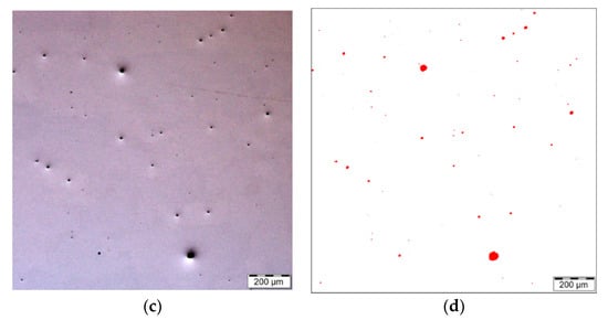 Light optical microscopy (LOM) images show porosity in the XY plane (a,b) and in the YZ plane (c,d) for the analyzed material; (a–d) correspond to sample 1 presented in Table 3.