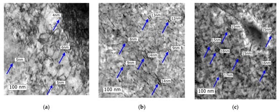 The areas of interest for TEM observations within sample 2, 5, and 7 included locations containing small precipitates. Detailed images of numerous precipitates formed across the examined XY plane within these samples can be seen in Figure 8a,c. The applied aging temperatures generally led to the formation of a large quantity of uniformly dispersed nanosized precipitates with needle-like and spheroidal shapes (indicated with dark blue arrows). These types of precipitates (especially the needle-like precipitates) were also observed by the authors of study [66]. The presence of precipitates, which are clearly visible within the structure, most probably contributed to the increased mechanical properties as well. Figure 8a shows a small number of needle-like shaped precipitates, which were about 4–6 nm in length. The density of nanoprecipitates was lower compared to samples 5 and 7 depicted in Figure 8b,c. The increased aging temperature not only led to the formation of a higher number of nanoparticles, but also to their larger size. Sample 5 (see Figure 8b) featured a higher number of precipitates corresponding to the higher aging temperature. The length of nanoprecipitates in sample 5 was higher (about 8–14 nm) than in sample 2 (sample 5 had the highest microhardness value in the XY plane after heat treatment). Clearly, the size of the nanoprecipitates gradually increased with increasing aging temperature from 420 °C to 520 °C. With increasing aging temperature, the precipitates tended to change their shapes from needle-like to spheroidal, which was also accompanied by an increase in size, i.e., 15–18 nm (see Figure 8c). The size and shapes of precipitates within sample 7 probably contributed to the decreased mechanical properties.