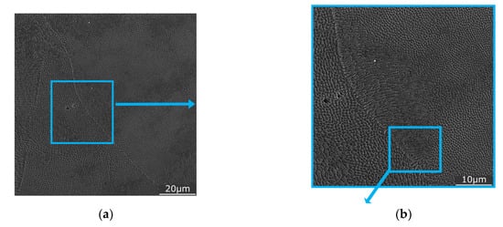 For comparison, sample 1 was also subjected to detailed SEM observations. Figure 9 shows a detailed view of the structure of this sample (XY plane) featuring individual grains within the characteristic melt pools (as seen in Figure 7a). The sizes and shapes of the grains and the entire melt pools depend on the relationship between their orientations and the printing process. In other words, very high cooling rates and differences in thermal conductivity in different directions are the most important factors that influence the formation of the structure, which subsequently affects the mechanical properties [47].