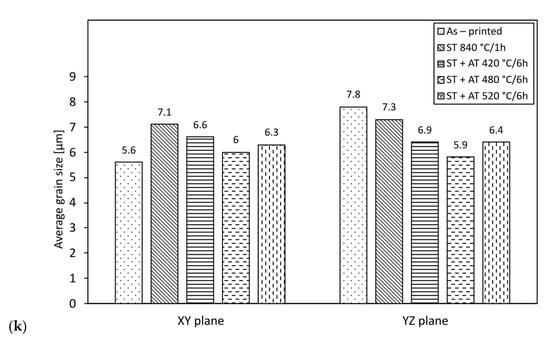 Figure 10g depicting the XY plane OIM of aged sample 2, together with the IPF for the sample depicted in Figure 10h, shows that the texture intensity further decreased after the 420 °C/6 h aging treatment. However, the HAGB fraction increased to 62.2% (compared to 54.9% and 59.7% achieved for the as-fabricated and solution-treated samples, respectively). The grain size decreased as well to a value of 6.6 µm in the XY plane and 6.9 µm in the YZ plane. The difference in these values for both the measured planes was comparable to that observed for the solution-treated sample. After aging at 480 °C (Figure 10i), the HAGB fraction increased to the maximum observed level of 72%, and the avg. grain size slightly decreased to 6.0 µm in the XY plane and 5.9 µm in the YZ plane. These values were the most homogeneous of all the examined samples. The OIM also indicates that the increased temperature caused the texture to begin forming again. This trend was also visible within sample 7, aged at 520 °C (Figure 10j). This sample also exhibited a decrease in the HAGB fraction to 59% (comparable to the sample after solution treatment and to aged sample 2) and an increase in the avg. grain size to 6.3 µm in the XY plane and 7.8 µm in the YZ plane. The difference between these two grain-size values was the largest of all the examined samples and points to some (undesirable) grain growth due to the effect of the increased aging temperature.