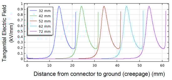 A fundamental design feature for MV/HV spacers is to optimize surface insulation system design, in which creepage and clearance are paramount quantities, specified in various standards [16]. In particular, they are meant to reduce the risk of macroscopic discharges that can instantly break the insulation system. However, it is likely that macroscopic surface discharges are preceded by surface partial discharges, PD, originated from triple points (electrode, surface, and surrounding medium), contamination (droplets, salt, and impurity clusters), or, in general, large field gradients. If the voltage at which surface PDs are incepted is lower than the nominal voltage recommended for insulation system operation (based on creepage criteria), the insulation will not undergo macroscopic discharges, but it will degrade rapidly at the PD location (extrinsic accelerated aging), resulting in premature failure (thus, lower-than-specified reliability). It is noteworthy that the occurrence of PD could not be hampered using the concept of creepage. As an example, Figure 1 shows how the maximum field on a PCB surface (from [4]) does not vary noticeably even when doubling the creepage. Hence, creepage and PD inception field/voltage must be considered in AND logic when designing surface insulation sub-system.
