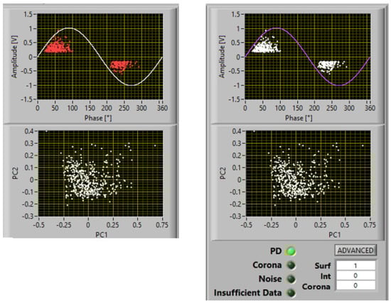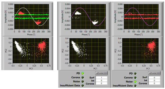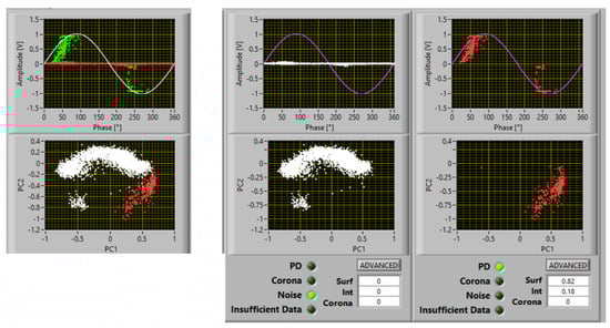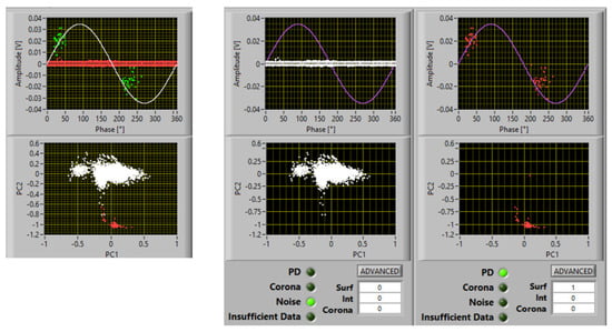 As an example, Figure 2 shows a screenshot of PD acquisition according to the innovative approach which allows recorded phenomena to be separated (principal component analysis (PCA) map), noise to be recognized and rejected, and PD source typology to be identified. The figure reports a case of measurements at 1.1 PDIV on a spacer insulating material specimen, with two subclusters in the PCA map, one recognized as noise and one recognized as PD, with identification of surface discharges with a large likelihood (82%).