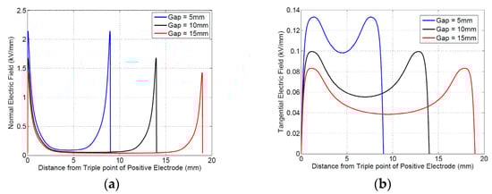 Simulated electric field with electrodes as shown in Figure 3: (a) normal field (orthogonal to specimen surface); (b) tangential field. The total distance shown along the x-axis is from triple point to triple point, with the triple point of the positive electrode as the origin. The gap (5 mm, 10 mm, or 15 mm) is between the electrode faces. Due to the electrode curvature, the triple point is located at 1.5 mm behind the face of each electrode.