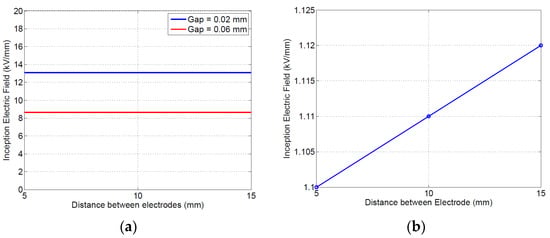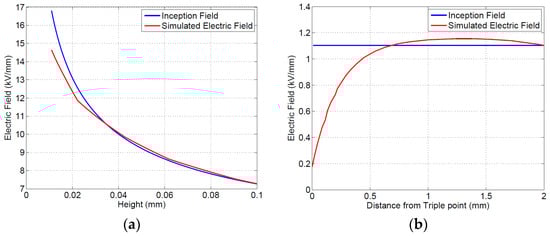 Simulation and modeling results on insulating material specimens shown in Figure 6 highlight that both gas and surface discharges may be incepted between 8.6 and 8.4 kV, for an electrode separation of 5 mm (the latter, i.e., surface discharge, seem to be slightly favorite). Upon increasing distance, the inception voltage for surface discharges increases to 13.5 kV, while that for gas discharge increases to 13.2 (see Table 3); thus, the likelihood of gas discharges is still comparable with that of surface discharges for the tested specimens (note that the gas discharge would incept very near to the electrode (Figure 6a), i.e., 40–50 μm, while surface discharge would occur at about 0.6 from the triple point.