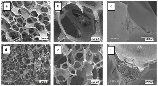 Figure 2a–c depict the open cell structure of the pristine polyurethane foam prior to the formation of SiC. The structure comprises a scaffold made of random connections of struts measuring ~500 µm and walls measuring ~0.25 mm2, dividing the space into interconnected open cells. Figure 2d–f show images of the foam after preceramic polymer deposition and subsequent pyrolysis. As expected, the initial structure of the PU foam is preserved, although the overall size of the open cell structure is reduced by a factor of two. The elimination and degradation of the PU template have been confirmed by submitting the pristine PU foam to the pyrolysis treatment (1200 °C-2 h in Ar). The measured weight loss was 97.45% and a brittle carbon residue was recovered.