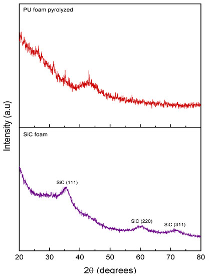Figure 3 displays the XRD pattern of the SiC foam, with three diffraction peaks at 2θ = 35.5, 60.7, and 71.3°, corresponding to the (111), (220), and (311) lines of cubic SiC, respectively. The width of these peaks is relatively large, which is not surprising considering the moderate pyrolysis temperature, leading to poorly crystalline SiC [35]. The diffraction pattern of the pyrolyzed pristine PU template shows an amorphous material with a large signal around 2θ = 43° and a typical (100) line of graphite corresponding to carbon atoms in a graphenic plane. Additionally, a very broad signal around 26° is characteristic of the residue of the 002 interplanar distance in amorphous carbon [36].