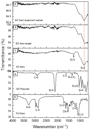 FTIR spectra for (a) PU foam template, (b) SiC precursor, (c) SiC foam, (d) SiC after photocatalytic experiment, and (e) SiC foam used and washed after photocatalytic experiment.