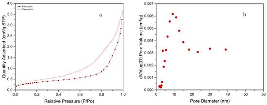 The nitrogen adsorption-desorption isotherms of the SiC foam are presented in Figure 5a. According to their shape and the IUPAC classification [40], it can be classified as a type IV isotherm typical for mesoporous structures. The SSA of the material was calculated by the BET method and reached values slightly above 1 m2/g, which is quite low, but one order of magnitude higher than values reported for SiC foams synthesized from preceramic polymer precursors by other authors [22]. Figure 5b shows the BJH pore size distribution for the SiC material. The distribution is quite large with a high contribution of mesopores with pore diameters at ~10 nm.