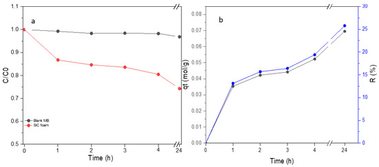 The adsorption capacity of the SiC foam was evaluated by immersing it in an MB solution for 4 h in the absence of light irradiation. A control experiment was also conducted, where a pure MB solution was left in the dark without the SiC foam. The evolution of MB concentration in the solution without any catalysts and the solution containing the SiC foam is shown in Figure 7a. In the absence of light irradiation and without SiC foam, the MB does not undergo any significant degradation over time. However, in the presence of the SiC foam, an important decrease in MB concentration is evidenced at the beginning of the experiment before reaching semi-equilibrium with a very slow rate of MB concentration decrease. This result thus suggests a non-negligible adsorption capacity of the SiC foam itself. The amount of MB adsorbed per gram of foam at a specific time t can be easily derived from Equation (2), as shown in Figure 7b (black curve) with the plot of qt vs. t. Moreover, from Equation (3), one can also quantify the evolution of the MB % present on the foam as plotted in Figure 7b (blue curve). The high adsorption rate at the beginning of the experiment results from a high number of available sorption sites. The progressive occupation of vacant adsorption sites [44] results in a deceleration of MB concentration decrease.