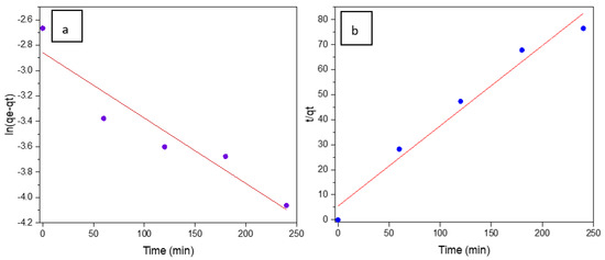 where qe and qt are the adsorption capacities at equilibrium and at time t, respectively. The value of (0.0051 min−1, with ) was obtained from the slope of the linear fitting of the plot of vs. t, shown in Figure 8a.