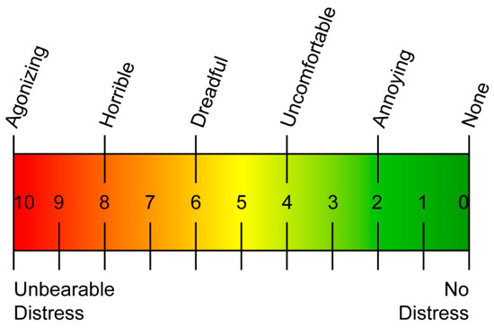 - Wewers, M.E.; Lowe, N.K. A critical review of visual analogue scales in the measurement of clinical phenomena. Res. Nurs. Health 1990, 13, 227–236. [Google Scholar] [CrossRef]