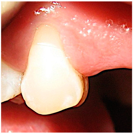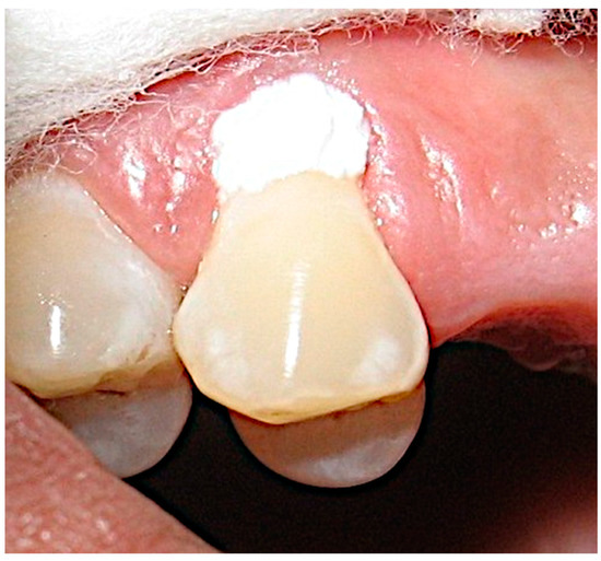 Sensitivity was measured using a metered air blast of a five-second duration on a visual analogue scale (VAS) with a rating of 0 to 10 [38] (Figure 2). Subjects having at least one tooth sensitive to air stimulation with a VAS rating of 3 or more were included in the study (T1). All 50 subjects included in the study had a VAS rating of 3 or more. The most sensitive tooth in the oral cavity was selected (Figure 3). Exclusion criteria included patients already using desensitizing toothpaste or mouthwashes which may alter the study, severe wasting disease of teeth, restorations in the quadrant of the study and extreme dentinal hypersensitivity which may require restorative or endodontic treatment. Before the start of the treatment, both groups received a thorough ultrasonic scaling. Sensitivity was re-assessed after ultrasonic scaling again (T1).