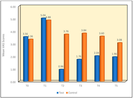 The Mann—Whitney test, performed for different time intervals, showed that there was no significant difference in the mean VAS scores between Test and Control group at T0 & T1 time intervals, at p = 0.48 & 0.68, respectively. However, at the T2 to T5 time intervals, the test group showed a significant decrease in the mean VAS scores as compared to the control group, and the mean difference in the VAS scores was statistically significant at p < 0.001 (Figure 5).