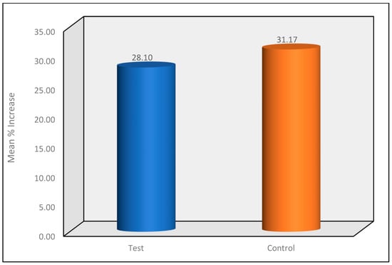 A comparison of the mean percentage increase in VAS between the two groups at the T1 Time Interval was carried out using Mann—Whitney Test. The mean percentage increase in the VAS scores from the T0 to T1 time interval showed that the test group showed a relatively lower mean increase in VAS scores as compared to the control group. However, the difference in the mean percentage increase in VAS scores between the two groups was not statistically significant at p = 0.53. (Figure 6).