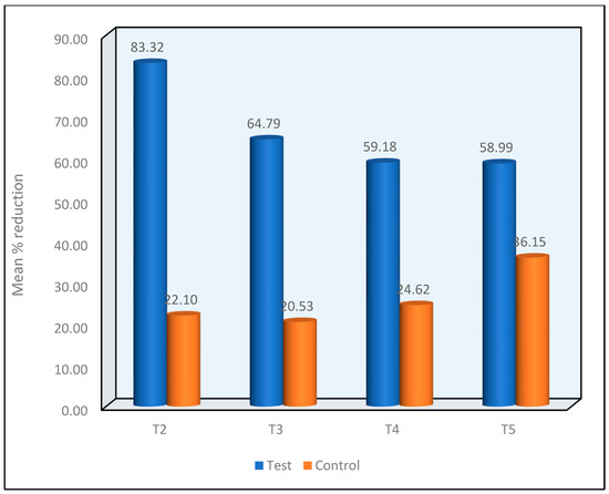 A comparison of the mean percentage decrease in VAS between the two groups at the T2 to T5 Time Intervals using the Mann—Whitney Test revealed that the test group demonstrated a significantly higher mean percentage reduction in VAS scores as compared to the control group and the difference between the two groups at the T2 to T5 time intervals was statistically significant at p < 0.001. (Figure 7).