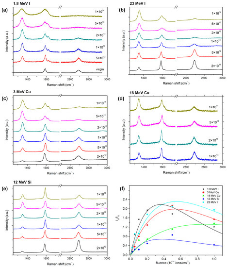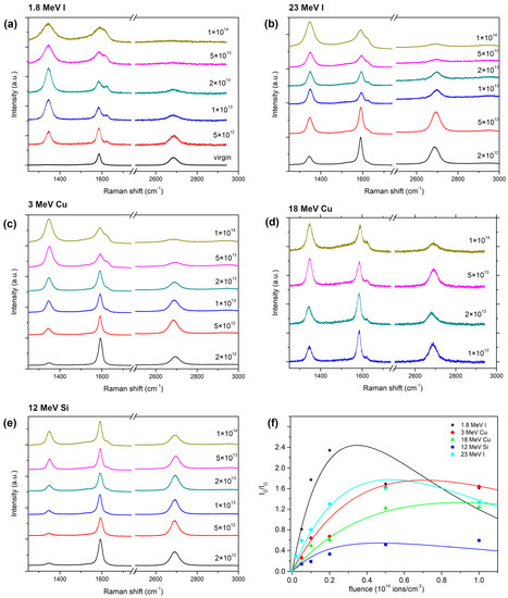Raman spectra (532 nm excitation wavelength) of BLG samples irradiated with (a) 1.8 MeV I, (b) 23 MeV I, (c) 3 MeV Cu, (d) 18 MeV Cu, and (e) 12 MeV Si. Ion fluences (depicted by different colours and given in ions/cm2 units) are given above each spectrum. (f) Ratio ID/IG for all used ion beams fitted using the Lucchese model (Equation (1)).