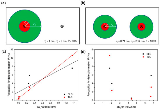 Illustration of the identical Raman response under the assumption of damage probability equal to (a) P′ = 50% and (b) P = 100% (x marks the ion impact spot). Damage production probability P for BLG and TLG, correlated with (c) nuclear energy loss dEn/dx and (d) electronic energy loss dEe/dx (calculated by SRIM [30] for the graphite).