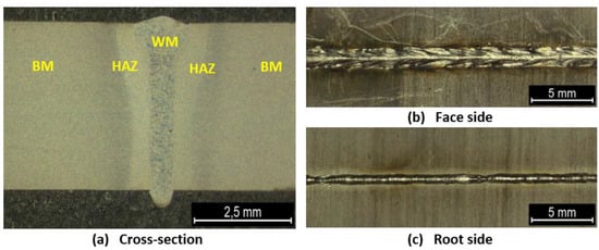 The macrostructure of the joints in the cross-section (a) and on the face (b) and root (c) side; WM—weld metal, HAZ—heat affected zone, BM—base metal.